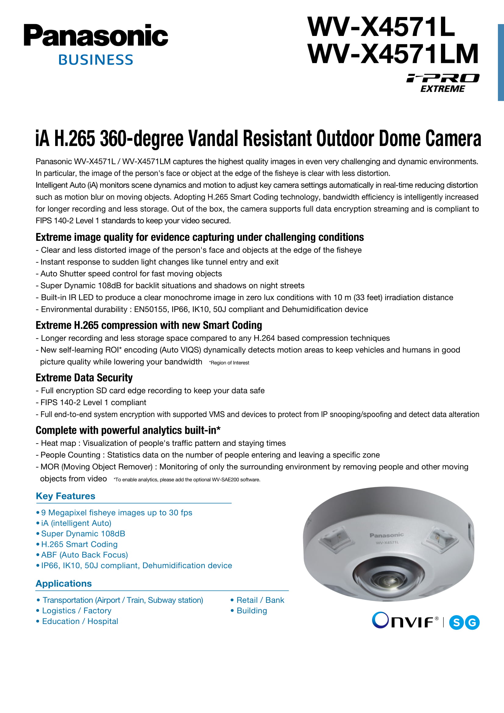 ![]() Extreme image quality for evidence capturing under challenging conditions - Clear and less distorted image of the person's face and objects at the edge of the fisheye - Instant response to sudden light changes like tunnel entry and exit - Auto Shutter speed control for fast moving objects - Super Dynamic 108dB for backlit situations and shadows on night streets - Built-in IR LED to produce a clear monochrome image in zero lux conditions with 10 m (33 feet) irradiation distance - Environmental durability : EN50155, IP66, IK10, 50J and electric dehumidifier Extreme H.265 compression with new Smart Coding (Click here for details) - Longer recording and less storage space compared to any H.264 based compression techniques - New self-learning ROI* encoding (Auto VIQS) dynamically detects motion areas to keep vehicles and humans in good picture quality while lowering your bandwidth * Region of Interest Extreme Data Security - Full encryption SD card edge recording to keep your data safe - FIPS 140-2 Level 1 compliant - Full end-to-end system encryption with supported VMS and devices to protect from IP snooping/spoofing and detect data alteration Complete with powerful analytics built-in* - Heat map : Visualization of people's traffic pattern and staying times - People Counting : Statistics data on the number of people entering and leaving a specific zone - MOR (Moving Object Remover) : Monitoring of only the surrounding environment by removing people and other moving objects from video *To enable analytics, please add the optional WV-SAE200 software. ![]() ![]() ![]() |